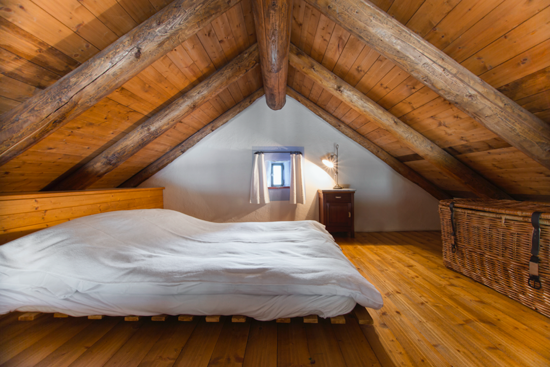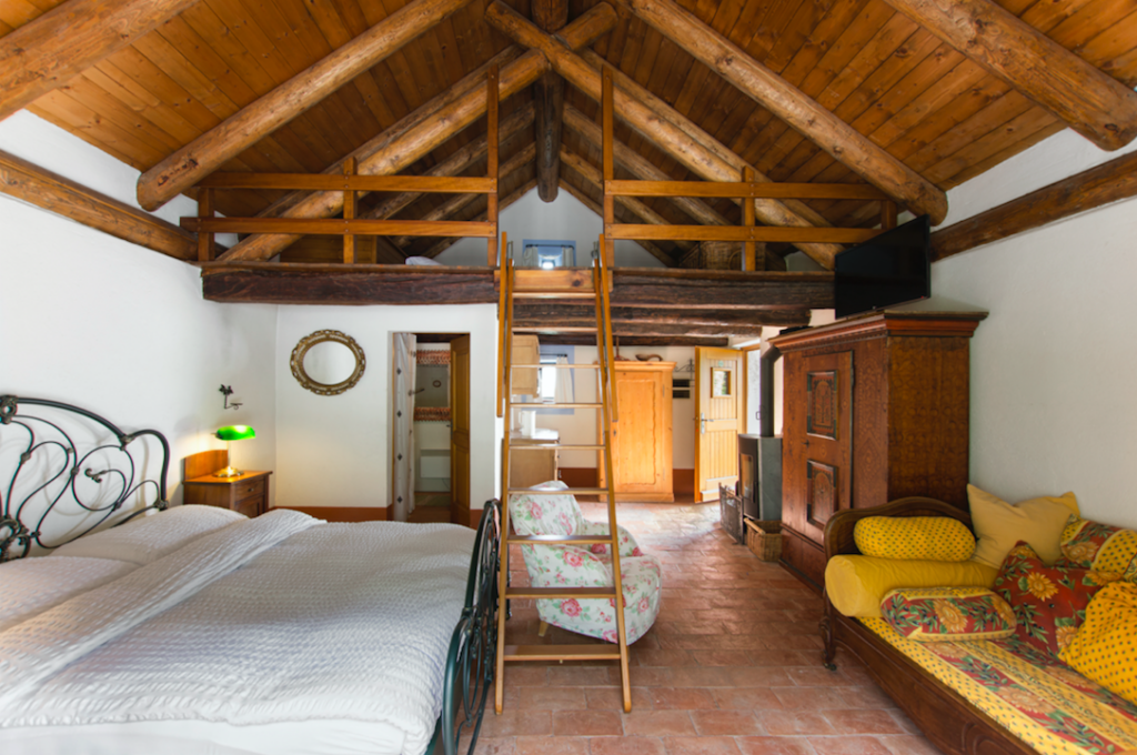 Das Zimmer im Obergeschoss des Rusticos bietet einen Aufenthalt voller authentischem Charme und starker Persönlichkeit, in einem grosszügigen, hellen und stimmungsvollen Ambiente. Die hohe Decke mit sichtbaren Balken, die luftigen Raumvolumen und die Galerie machen den Raum besonders eindrucksvoll und bewahren zugleich den ursprünglichen Charakter der Struktur.