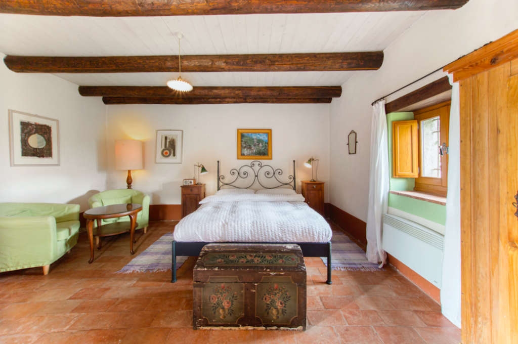 Das Zimmer im Erdgeschoss unseres Rusticos empfängt die Gäste in einem grosszügigen, schlichten und stimmungsvollen Ambiente. Sichtbare Balken, der Kamin und die natürlichen Materialien erinnern an den authentischen Charakter des Hauses und schaffen einen warmen und entspannenden Raum, ideal für alle, die Ruhe und Schlichtheit suchen.